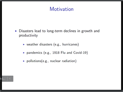 在报告中,杨教授首先从灾难对及经济社会的影响出发讨论了减灾及预防灾难发生的必要性,灾难会对财富财产带来负面影响,对实物资本和资产的伤害也不可忽视。既有研究表明,分析和防范风险需要从当下做起,关注事先准备(FEMAwebsite);世界卫生组织(WorldHealth Organization)的报告也说明事前准备工作的充足性会直接影响灾难带来的损失程度。接着,杨教授构建模型分析灾害的严重程度、减灾费用与减灾效果的关系,家庭从外生的自然灾害中了解灾害到达率,并支付减灾费用来减轻未来灾害造成的损失。杨教授的研究表明,当灾难发生时,如果仅靠市场运作,市场上就会需要除自己以外的人去减灾。减灾作为公共物品,必然会有“搭便车”的企业或个人,竞争性市场无法有效发挥作用,因而需要政府动员所有人去减灾,政府可以通过资本税和减灾支出补贴的方式解决“搭便车”问题。不过,减灾费用在降低总体风险和确保可持续增长的同时也降低了消费、投资和股票市场价值。