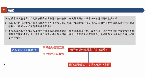 余明桂教授首先指出我国债券市场是全球第二大且具有系统重要性的债券市场,但是债券融资在社会融资规模中占比较少,还有较大发展空间。现有研究表明交易所债券市场比银行间市场发展更有利于服务实体经济,但银行在相当长的时间内仍然是我国债券市场的主要投资者。为此,余明桂教授以银行准入交易所债券市场这一外生冲击切入,探究市场分割对债券市场效率的影响。余明桂教授团队通过设定二级市场债券季度交易量、债券信用价差、违约利差、流动性利差等变量,利用双重差分模型分析银行进入交易所市场对一级市场的影响。研究结论表明,银行准入债券市场放宽可以提高债券市场效率、降低融资成本,支持实体经济发展。