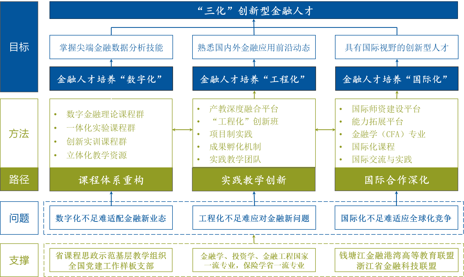 面向国家金融强国建设战略,金融行业数字化转型现状,以及浙江省金融改革先行地对金融人才培养的重大需求,依托学校“工商融合、文理贯通”多维立体学科格局,学院确立并不断深化了“数字化、工程化、国际化”创新型金融人才培养体系。该体系以金融学大类培养为基础,确立了“思政铸魂,技术赋能”的育人新理念,重构“理论、实验、实训”的递进式数字化课程体系,深化“问题导向、项目载体、成果孵化”的工程化实践教学体系,推动“专业、课程、资格认证”的国际化视野培养体系,为区域经济发展输送了大量高质量创新型金融人才,相关成果获浙江省教学成果奖二等奖2项。