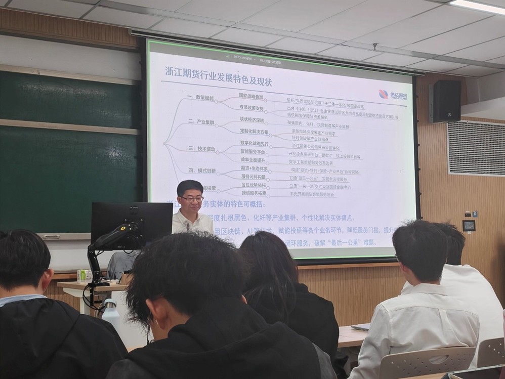 罗总从期货行业基础、期货市场发展历程、信达数智赋能实践和职业前景四个方面展开了讲座。他首先以新能源车企原材料价格波动为切入点,生动说明期货和期权在企业风险管理中的关键作用,并以现货、远期、期货、期权的差异及主要交易所品种体系为例,帮助学生构建完整的衍生品工具框架。其次,在介绍我国期货市场发展历程时,他详述了从1990年代萌芽期的无序竞争,到整顿、规范、创新再到近年来的高质量发展阶段,特别强调“期货和衍生品法”实施后行业在法治化、国际化和品种体系建设上的显著进步。在数智赋能期货行业部分,他展示了信达期货在数字化转型中的实践,包括移动化一体平台、智能投研平台、数据业务中台等前沿应用。最后,他结合期货公司经纪、资管、风险管理、做市等业务类型,分析行业对AI算法工程师、量化研究员、数据管理、智能风控与复合型金融科技人才的强烈需求,鼓励学生把握数智时代的行业机遇,积极提升跨学科能力与实践技能。