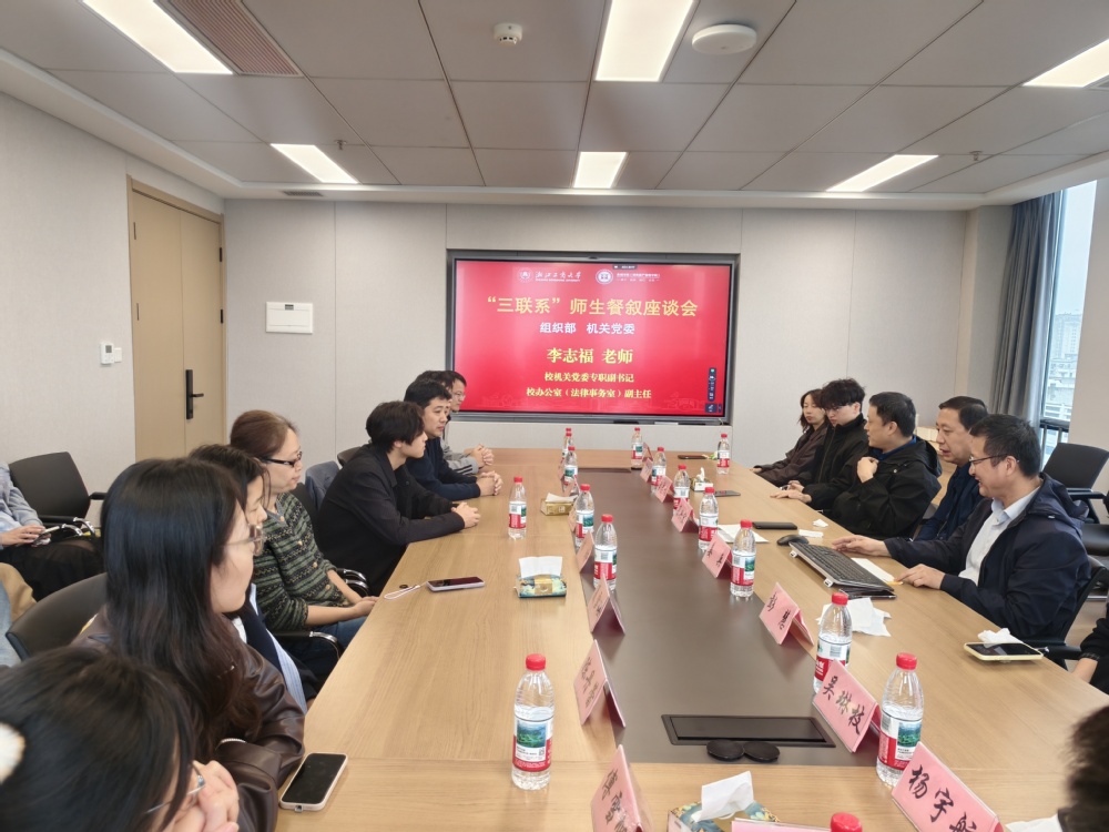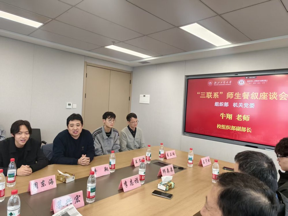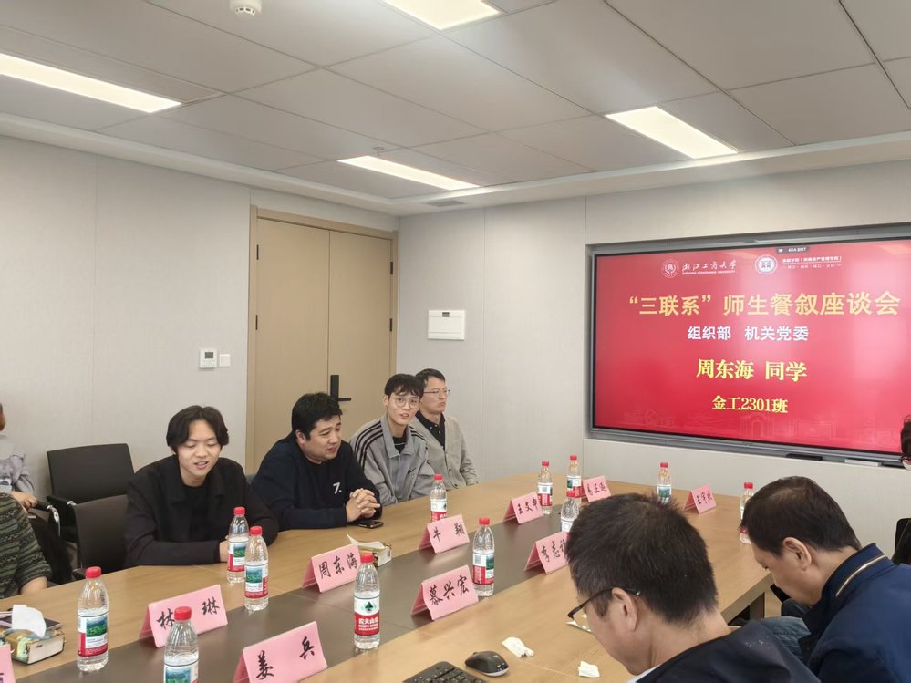 学院党委书记慕兴宏充分肯定了“三联系”工作对学生成长的积极作用,并对“三联系”老师致以衷心感谢。校办公室(法律事务室)副主任李志福、组织部副部长牛翔、林琳等老师详细了解“三联系”同学的学习、工作和生活情况,勉励同学们要珍惜韶华,脚踏实地,全面发展,在人生的马拉松上跑好浙江工商大学这一程。金工2301班周东海同学做了成长分享。同学们一一发言,气氛温馨融洽,老师们并对同学们提出的困惑给予耐心细致的解答,并表示随时欢迎同学们交流沟通。
