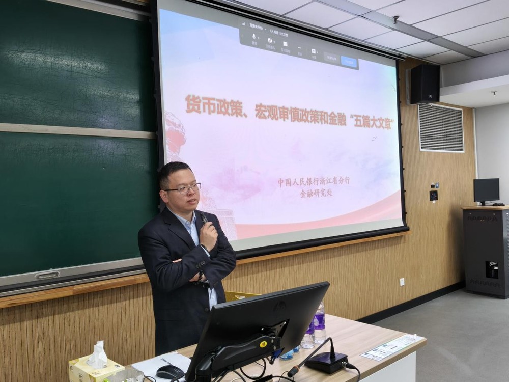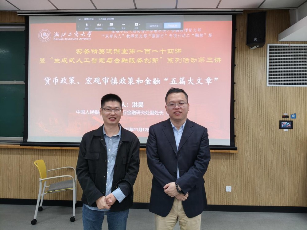 11月12日下午,由浙江工商大学金融学院(浙商资产管理学院)金融教师党支部、地方金融创新监管研究中心、钱塘江金融港湾高等教育联盟、浙江省金融科技产教融合联盟与浙江工商大学金融学院(浙商资产管理学院)联合开展的“生成式人工智能与金融服务创新——金融业界精英进课堂”系列活动第三讲,在教学楼A222教室与线上钉钉直播同步开展。此次活动也是金融教师党支部“双带头人”教师党支部“强国行”专项活动中实践育人系列活动之一,邀请到了中国人民银行浙江省分行金融研究处副处长(主持)洪昊作为主讲人,演讲主题为“货币政策、宏观审慎政策和金融‘五篇大文章’”,线上线下200余人参与。