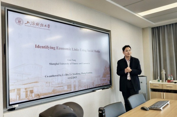 2025年12月12日上午,浙江工商大学金融学院(浙商资产管理学院)在科创楼836成功举办第265期钱塘金融强国学术论坛。本期学术论坛邀请到了上海财经大学财税投资学院郭峰教授,为学院师生带来一场题为“Identifying Economic Links Using Social Media”的学术报告。金融学院执行院长方霞教授主持了本次会议,学院近30位师生参加了本次学术交流。