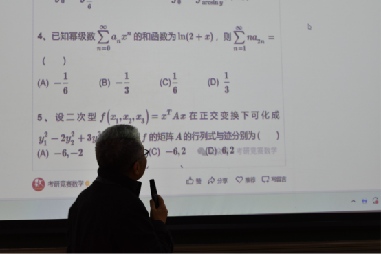 讲座中,江涛教授精准剖析了考研数学备考的核心痛点:教材固定框架与考试灵活要求之间的落差,导致部分考生因基础原理理解不深、解题策略固化,面对看似“超纲”“新颖”的题目时陷入困境。他以典型真题为切入点,通过传统解法与优化思路的对比拆解,生动诠释了“化繁为简、直击核心”的解题逻辑,直观展示如何跳出常规思维、洞察题目本质。他强调,考研数学能力提升的关键不在于“题海战术”,而在于对经典题型的方法反思与升级,建立 “通法”与“巧解”的有效联结,实现解题效率与准确率的双重提升。