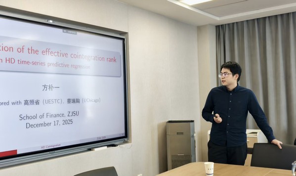 2025年12月17日下午,由浙江工商大学人才办和金融学院(浙商资产管理学院)主办的钱塘国际青年学者创新发展论坛在科创楼836成功举办。本期论坛邀请到了浙江大学理论经济学博士后方朴一,为学院师生带来一场题为“Determination of the effective cointegration rank in HD time-series predictive regression”的学术报告。金融学院执行院长方霞教授主持了本次会议,学院近30位师生参加了学术交流。