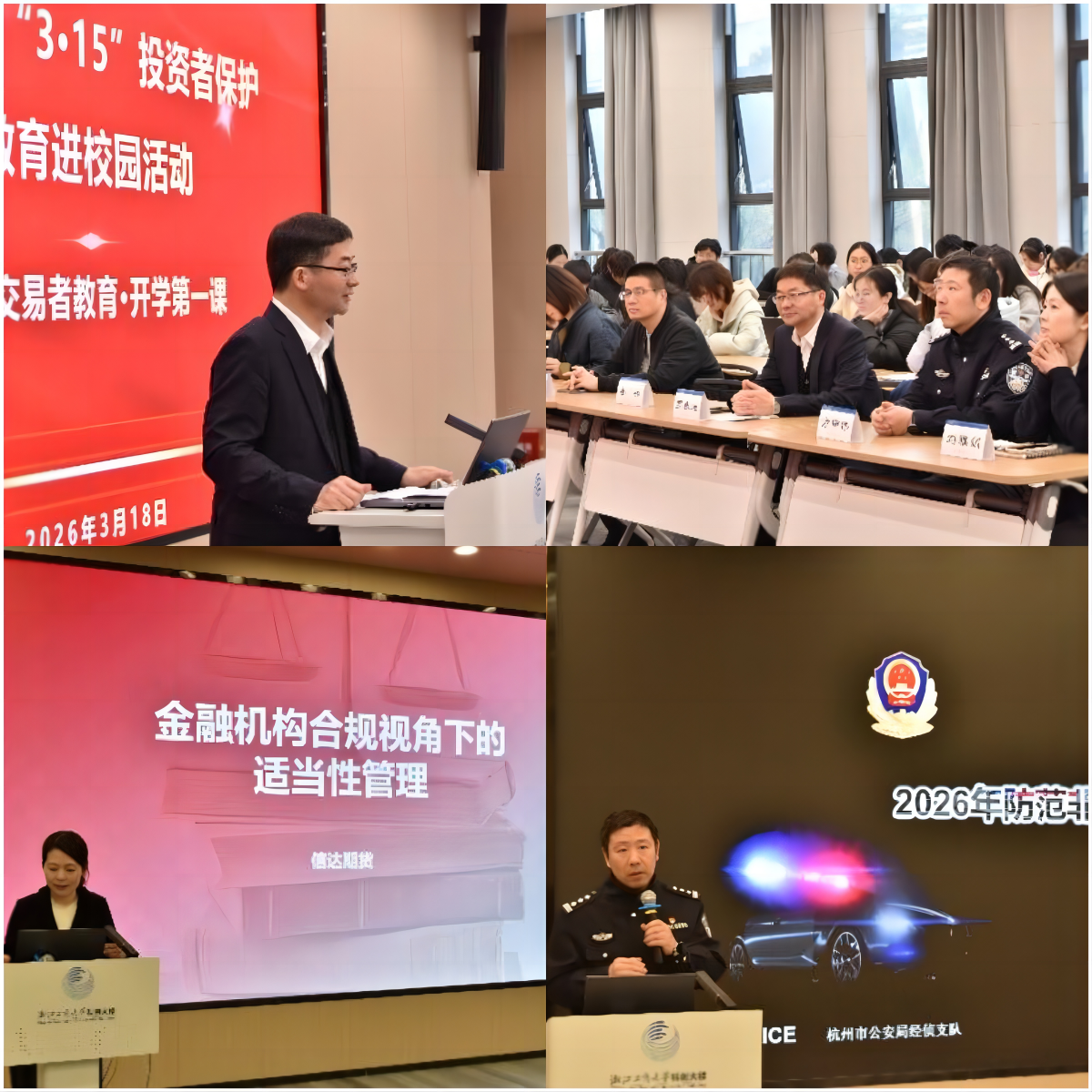 为积极响应“金融强国”时代号召,提升铸魂育人实效,着力培育立足实体经济、兼具底线思维与创新担当的新时代金融英才,3月18日,金融学院(浙商资产管理学院)联合浙江省期货行业协会、信达期货有限公司等单位,并在杭州市公安局经侦支队支持下,举办“金融为民,强国有我”投资者教育实践活动。活动以主题讲堂为核心,融合“3·15”投资者保护宣传与《生活中的投资者教育》课程教学,通过政产学研协同,构建金融素养培育新模式。