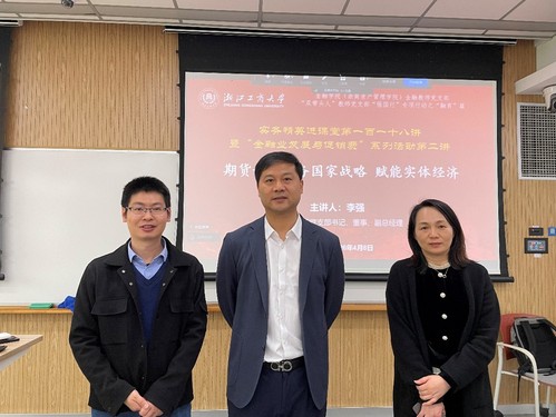 4月8日下午,由浙江工商大学金融学院(浙商资产管理学院)金融教师党支部、地方金融创新监管研究中心、钱塘江金融港湾高等教育联盟、浙江省金融科技产教融合联盟与浙江工商大学金融学院(浙商资产管理学院)联合开展的“金融业发展与促销费——金融业界精英进课堂”系列活动第二讲,在教学楼A124教室与线上钉钉直播同步开展。此次活动也是金融教师党支部“双带头人”教师党支部“强国行”专项活动中实践育人系列活动之一,邀请到新湖期货党支部书记、董事、副总经理李强为主讲人,演讲主题为“期货如何服务国家战略,赋能实体经济”,线上线下共200余人参与。